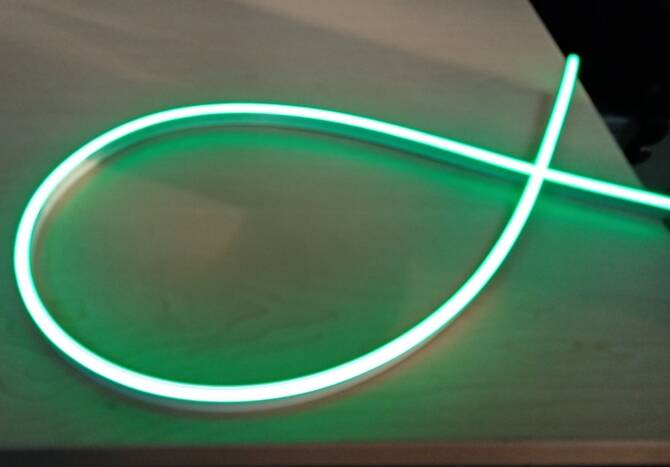 Але зблизька, під час детального огляду, звісно, такий лед неон кардинально відрізняється від скляної трубки. Адже по суті - це звичайна світлодіодна стрічка в силіконовій або напів-силіконовій оболонці. Причому здебільшого світлодіоди в стрічці світять в її боковину, завдяки чому силіконовий розсіювач, що розміщений зверху матеріалу, не може рівномірно згладити свічення цього виробу, і за умови детального огляду, на ньому неодмінно буде видно і засвітки і затемнення по черзі.